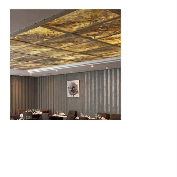 - ติดตั้งแผ่นหินบนอะคริลิคใสขุ่นก่อน แล้วนำไปติดกับโครงหน้างาน โดยใช้กาวซิลิโคนใสในการติดระยะห่างแผ่นที่ติดอะคริลิคควรห่างจากไฟ 12-15 cm. เพื่อไม่ให้เกิดรอยของไฟ